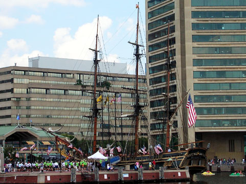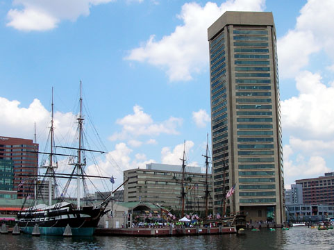 The whole of the World Trade Center looking down on the Bounty and the Constellation. Baltimore was very festive this July weekend, still celebrating Palmiero's 3000th hit, with outdoor Andean music and hip-hop at points around the harbor and lots of cruise ships preparing to sail in the evening.