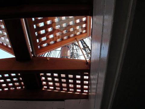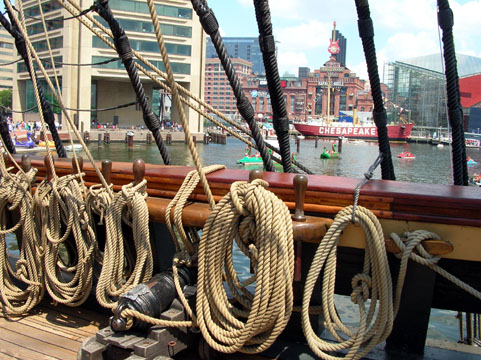 Looking toward the front of the ship, docked with her prow toward Harborplace.