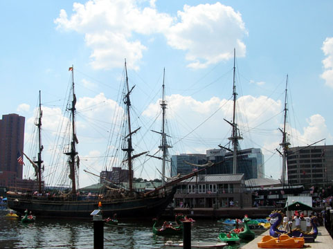 The HMS Bounty was in Baltimore for the weekend. This is a Canadian-built replica of Captain Bligh's vessel, built in 1960 for the Marlon Brando Mutiny on the Bounty and acquired by Ted Turner when he bought the MGM film library; he has since donated it to a tall ship organization that uses it for sail training and cruises.