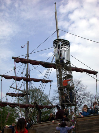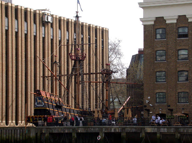 The Golden Hind, Sir Francis Drake's ship, seen from the Thames in London.
