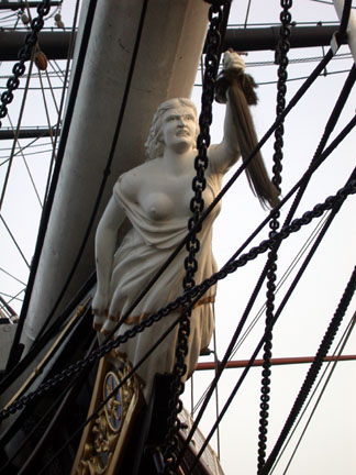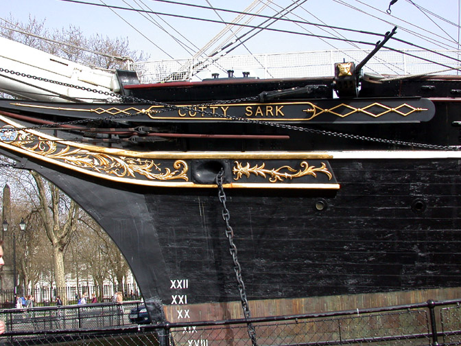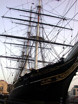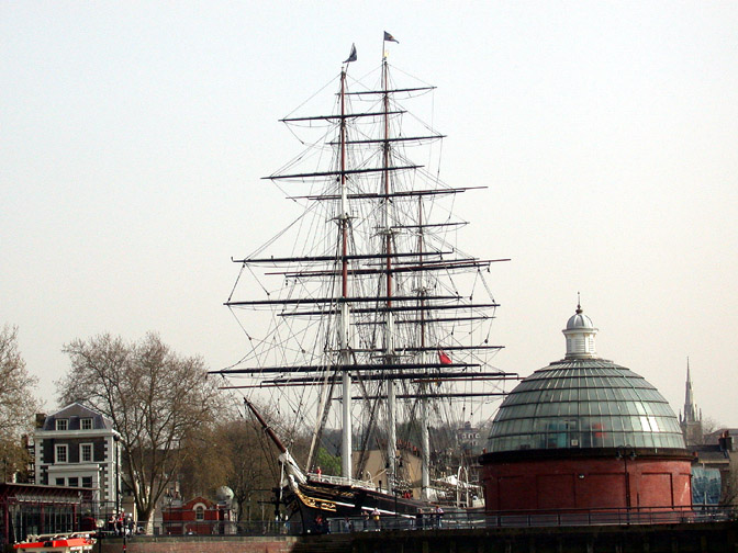 The Cutty Sark seen from the Thames approaching Greenwich.