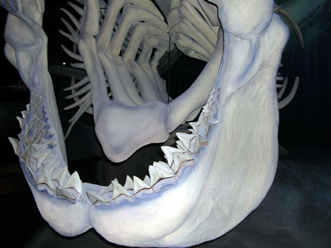 The mouth of an extinct shark, carcharodon megalodon. Those front teeth are larger than my hand.