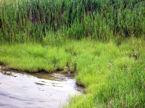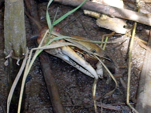 A fiddler crab hides in the grass in the salt marsh at the Calvert Marine Museum.