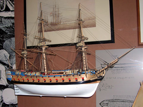A model by Al Chesley and painting of HMS Augusta, 64-gun ship of the line, one of five Royal Navy warships of this size or larger present in the Patuxent River during the summer of 1814. The Chesapeake Flotilla kept the British at bay for four months, but the British army marched north through Charles County -- the only time Maryland's shores have been invaded by a foreign army -- and the flotilla was scuttled and sunk to prevent capture so that its men could join the land defense just before the British burned Washington in August. British General Robert Ross was so impressed by the actions of American Commodore Joshua Barney that he pardoned all of Barney's "Bluecoats" -- a decision he later had cause to regret when the British fleet was kept out of Baltimore's harbor by men in Fort McHenry while Ross, who led the land attack, was mortally wounded by one of Commodore Barney's pardoned sharpshooters.