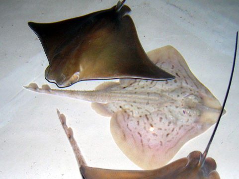 Cownose rays swim over a skate in the tank in the "Secrets of the Mermaid's Purse" exhibit tank.