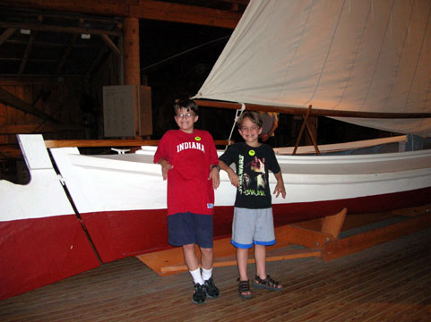 Daniel and Adam beside one of the locally built ships on display in the museum.