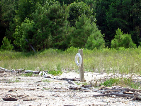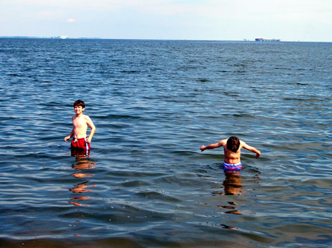 The boys in the Chesapeake. The Chesapeake Bay was very warm, about 85 degrees -- by late afternoon the air was actually cooler -- and the salinity was low enough that we did not encounter any jellyfish, so we spent nearly two hours in the water, swimming and wading (the bottom is very level at Flag Ponds; one can walk quite a distance from shore with the water only at waist level) and then sitting in the middle of the banks of seaweed looking for shark's teeth.