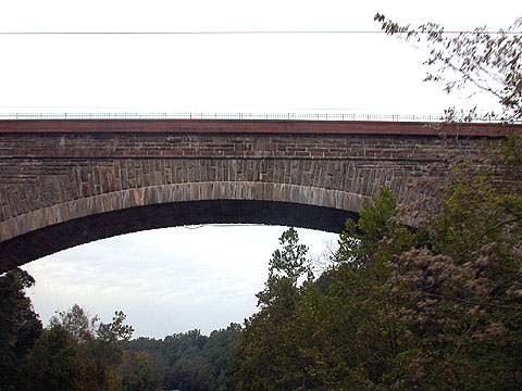 This is the "high road" going over the "low road" as they called it on the CB radio (the "Canal Road Bums" were what the DC commuters called themselves) before everyone got onboard navigation systems and wireless traffic updates instead. That's Macarthur Boulevard narrowed to a single lane at this old stone bridge that takes it over the Cabin John Parkway. The bridge contains a conduit to the Washington aqueduct.