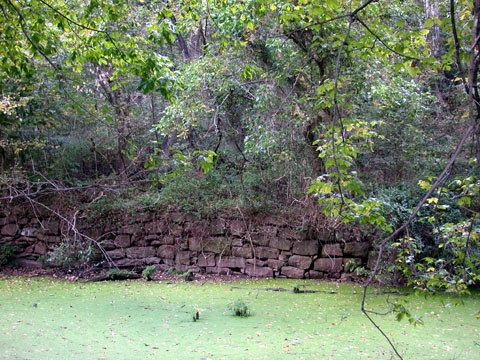 The C&O Canal here is thick with weeds in places, covered with leaves in others and coated with surface growth in spots like this one.