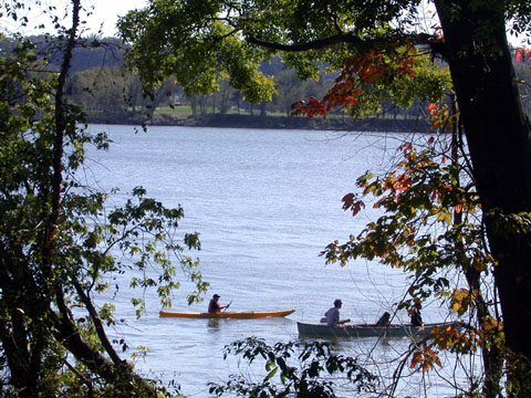 The leaves are only just beginning to turn around here, which makes this perfect weather for canoeing and kayaking on this smooth part of the Potomac -- compare this to a few miles downriver at Great Falls!