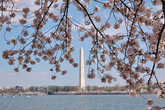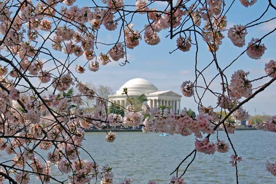 Annual photo of the Jefferson Memorial draped with overhanging blossoms.
