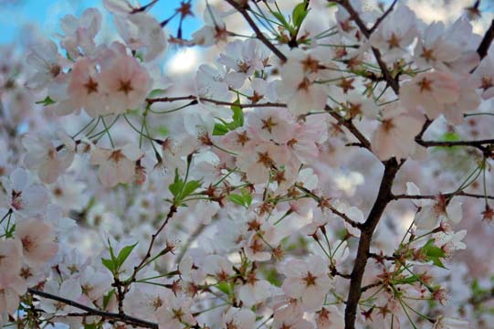 Close up of the flowers. They range in color from nearly white to an icy pink.