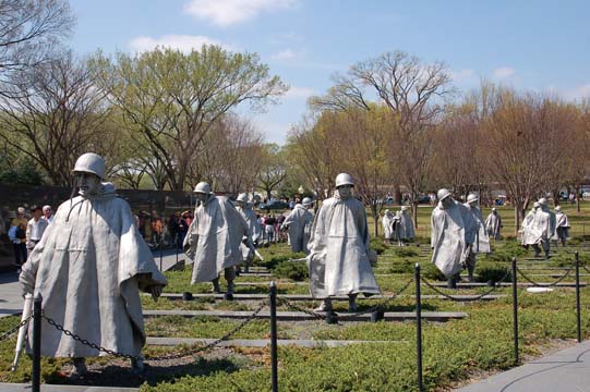 The Korean War Memorial, which also has a wall, though this one is engraved with images of soldiers and civilians rather than with their names. The names of all the nations that took part in the engagement circle around the statues of soldiers from many parts of the world.