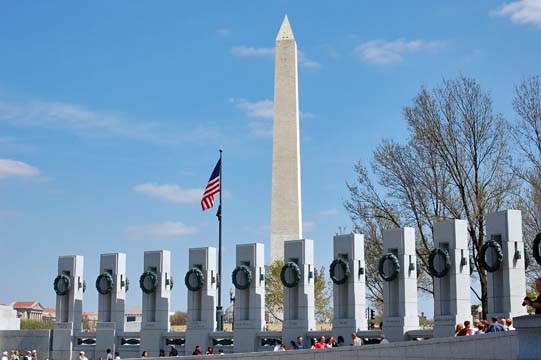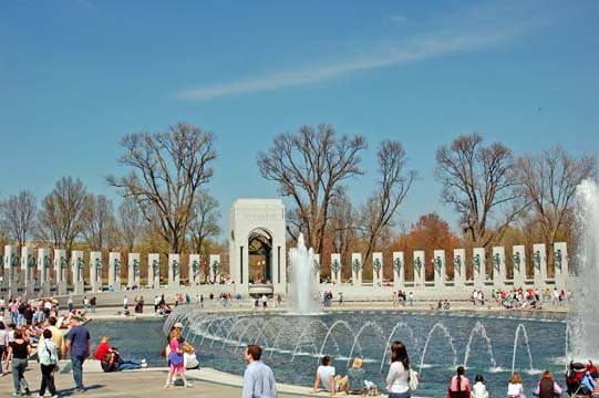 The relatively new World War II Memorial, which has large archways at either end -- one for the Atlantic theater, the other for the Pacific theater -- and the 48 states and territories named beneath the wreaths on the pillars.
