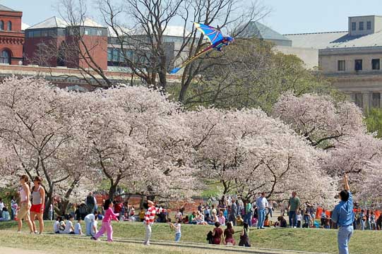Dragon kite above cherry blossoms along Raoul Wallenberg Place, between the Washington Monument and the Tidal Basin.