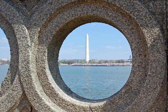This is my favorite photo I've ever taken of the Washington Monument, through one of the carved holes on the bridge to the Roosevelt Memorial from the Jefferson Memorial as one walks around the Tidal Basin.
