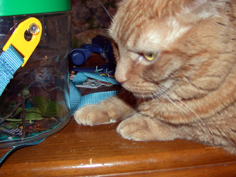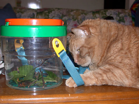 From this point on you need take no further steps, for your cat(s) will discover the large bugs crawling around and will spend the next hour mewling and batting fruitlessly at the outside of the jar(s), trying to figure out how to get at the cicadas. Even after your children have let the cicadas go, your cats will spend many pesked hours batting at the empty jar trying to figure out what has happened to the bugs. It crawls! It climbs! Obviously it must have world domination on its mind. And without opposable thumbs, there is absolutely nothing a cat can do about it.