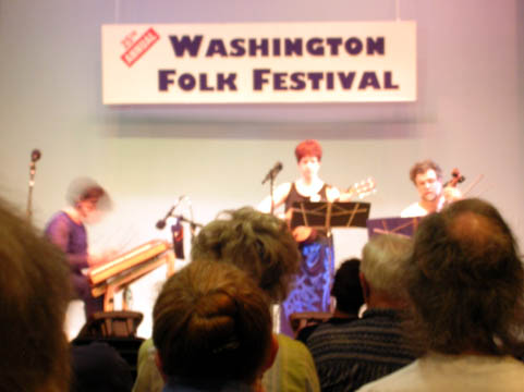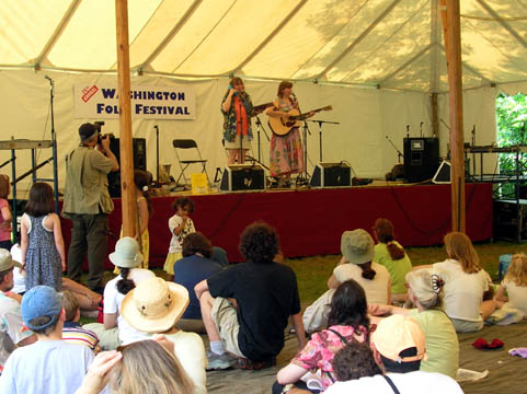 Cathy Fink and Marcy Marxer on the Crystal Pool Stage. The ground was so wet from the week's rain that the organizers had a tarp down over a lot of it for people to sit on.