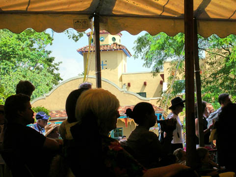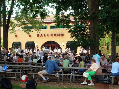 The picnic area in front of the Spanish Ballroom, packed for the folk festival.