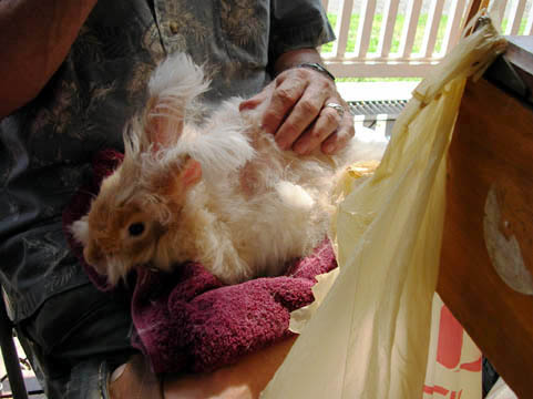 An angora bunny being combed for fur in the large craft display in the bumper car pavilion at the festival.