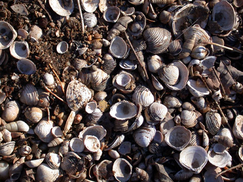 Some of the invaders from the river washed ashore during a past flood; none of these are indigenous, they were dumped into the river by ships and are choking off the native fauna.
