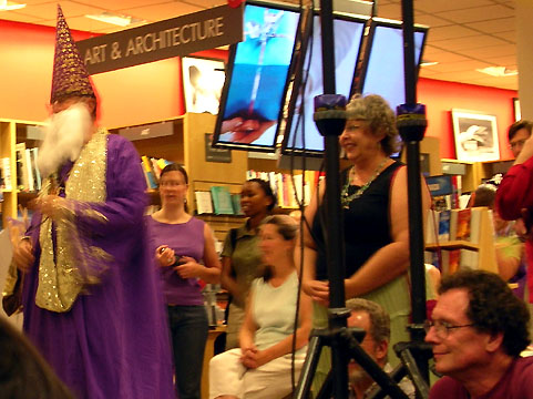 We stuck around Borders for over an hour after the concert because they were supposed to have an uplink to a feed of J.K. Rowling reading from the new novel on those screens -- Silver Spring was one of only three Borders in the US to have such footage -- but they couldn't get their video working, and the kids were tired and cranky, so finally we bowed to pressure and left.