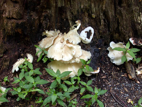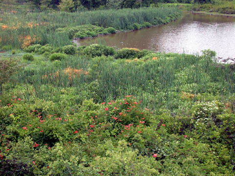 Pink trumpet flowers hiding hummingbirds, white Queen Anne's Lace, brown cattails and bright orange dodder (which looks like silly string but is unfortunately parasitic).
