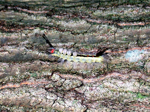 Some kind of caterpillar. This is not color-corrected, though I did use a flash; those are actually the colors of the bug and the bark in extreme close-up.