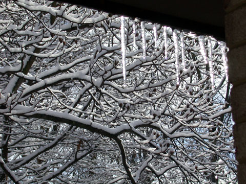 Trees in front of our house covered with snow and ice in the late afternoon sunshine, early 2005.