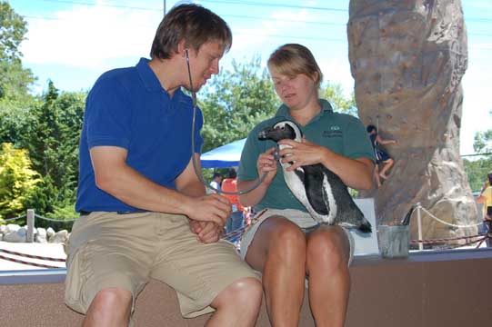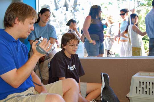 And we got to play vet with them, the way volunteers get to do sometimes at the Baltimore Aquarium with dolphins, which the trainers say helps them get comfortable with doctors for when they need them. Here is Paul bonding with a penguin.
