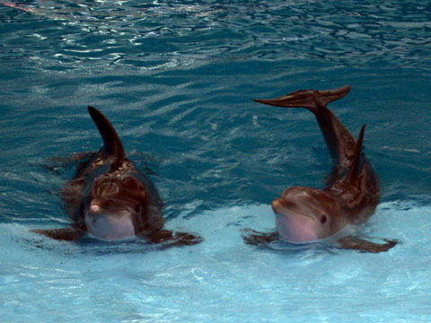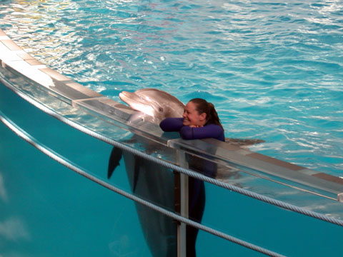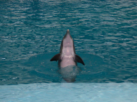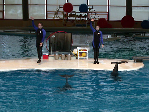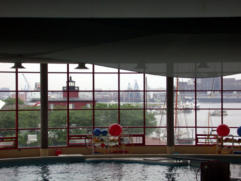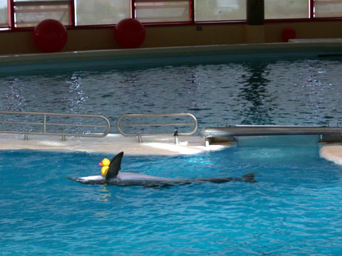The dolphin tanks overlook the harbor, including a lighthouse and many boats and ducks.