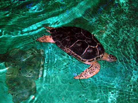 The tank also contains a sea turtle that lost a flipper in a net, was rehabilitated, and will probably live out its life in this aquarium tank.