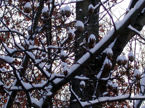 I love the way the remains of the flowers on the tulip trees act like little egg cups to catch the snow.