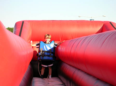 And here is Adam before the game in the kids' play area, where there was some jumping-and-scoring thing, as well as kicking practice, slides and music, plus free SpongeBob screensaver CDs.
