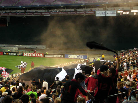The Screaming Eagles, devoted DC United fans who raise money for charity when they're not throwing confetti, waving pirate flags, displaying up an enormous banner that takes at least 20 people to hold up or banging drums to cheer on the team. This was just after a goal, when the big banner and whatever form of fairy dust they wave around were still up.