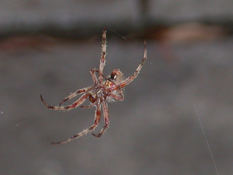 Spider spinning out over the river between two fences at Great Falls, Maryland.