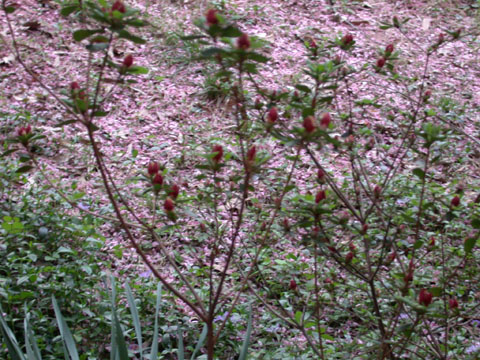 Before you get jealous, this is what it does to the sidewalk around it...hiding the thousands of berries that fall all year round. In the foreground is a red azalea about to burst forth.