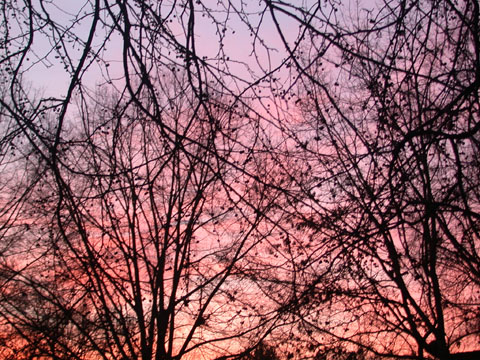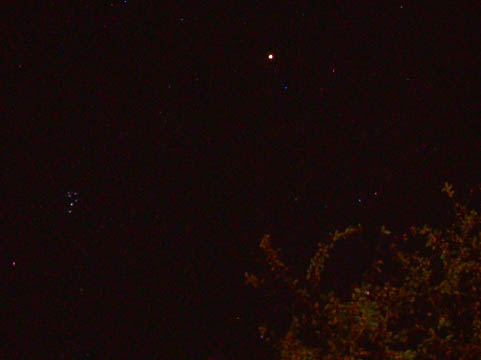 And post-sunset, fall 2005. The bright spot near top center is Mars; the small kite-shaped constellation on the left is the Pleiades. I do not swear it but I believe the red star at far left may be Aldebaran, the eye of Taurus.