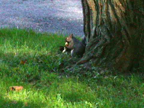 A pesky squirrel that stole a pizza crust right out from under our picnic table and ran off to eat it.