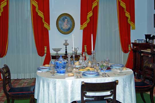 Du Pont amassed an amazing collection of pre-1860 Americana (he felt that everything produced afterward was too industrialized). This is the dining room, set here for the season with draperies and china in spring colors. Du Pont believed in using natural light, so there was no chandelier, just big windows and candles.