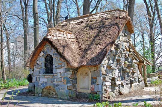 The Faerie Cottage. Inside is an ornamental fireplace with cauldron, a set of mini-thrones and a large carved Green Man on the wall.