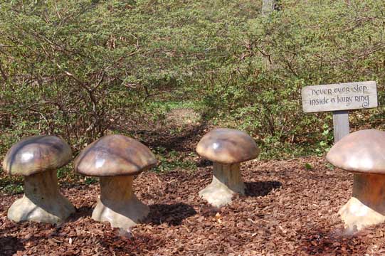 Visitors who step inside this fairy ring in the summer are sprayed with mist from the bases of these toadstools -- if you look at the bottoms, you can see the mist dampening the ground.