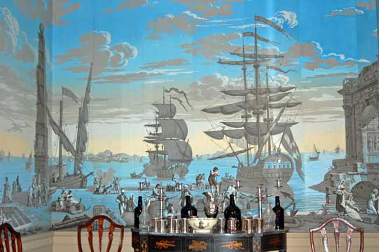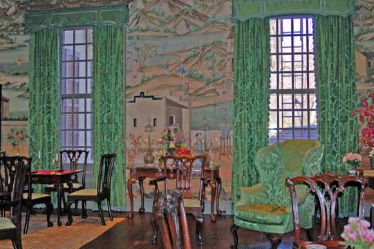 The wall coverings in this room are painted screens from late 1700s China, while the furniture is Chippendale-style with Oriental ornamentation as was popular among wealthy Westerners of that era. The scenes depict Chinese village life and are non-repeating; the areas above doors and windows were painted to match, so as not to miss any of the scenes, and that paint has darkened more than the screens, so that it's easy to tell what was added. This was used as a game parlor -- note the card table in the back left -- and had shelves of gorgeous Asian porcelain vases.