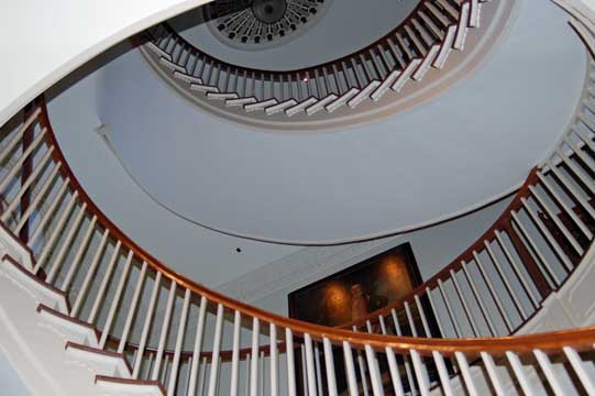 This spiral staircase was brought to Winterthur from its original setting in a mansion in North Carolina to replace the marble one that was originally here, put in by an earlier resident. Henry Du Pont had it built up two additional stories by the woodworkers on the property who had worked on the barns for the dairy farm.