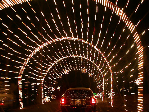 An almost-full moon over the swans and castle in the lake at the Seneca Creek State Park drive-through Winter Lights Festival. Every year I promise myself that I will make my own winter holiday music mix instead of listening to the awful stuff they broadcast within the park and every year I forget, but despite the cheesy music and the lack of snow on the ground this year, it was still very pretty, enhanced by a nearly-full moon.
