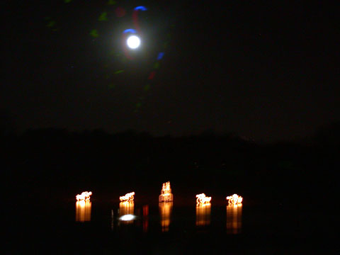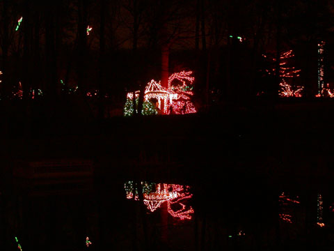From across the pond, the lights of the pagoda, some of the bushes and the giant dragonflies.