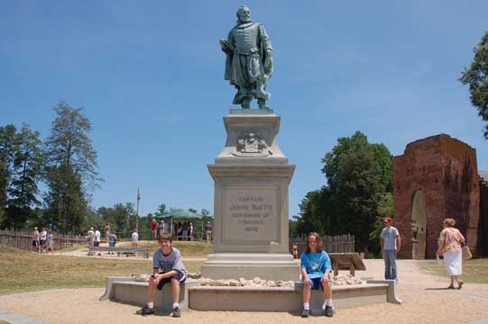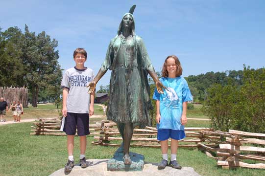 Pocahontas' statue it outside the settlement walls, toward the woods.