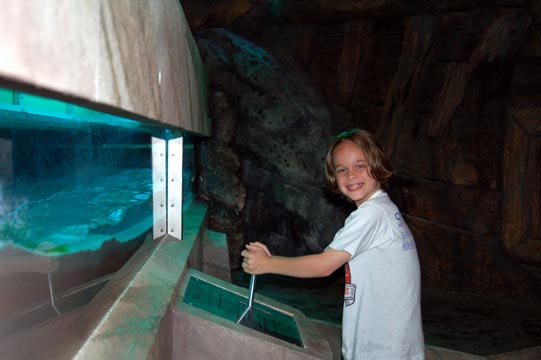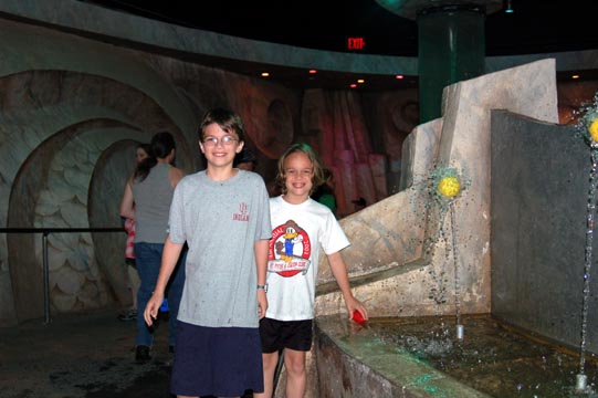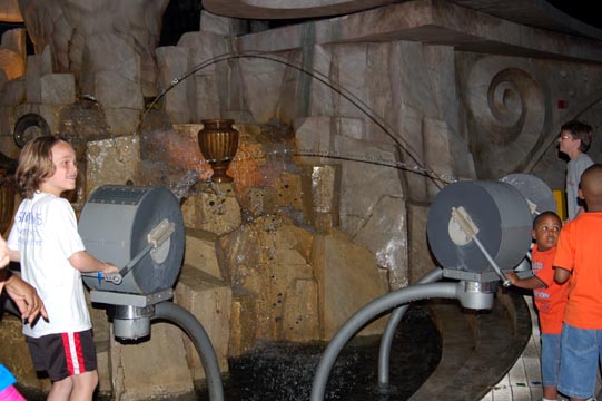 Kids aiming water jets at the giant fake urns beneath Poseidon in the ocean exhibit.